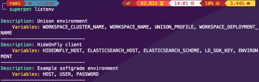 When listing environments, Superpet hides the values of the variables, but shows their names to better describe the environment.